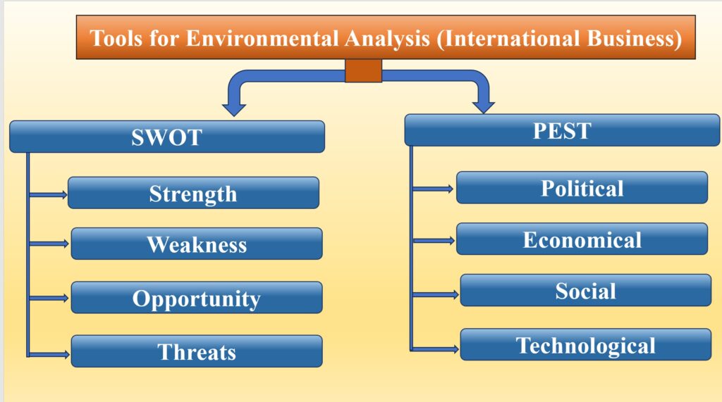 The businesses always make internal and external business analysis. the internal business analysis studies the factors which are under the control. and the external business analysis study the factors that are beyond the control. Business environmental analysis enables the business organization to formulate appropriate strategies. It contributes to achieving the expected objective or help to solve a specific problem for which the strategy is formulated. International businesses are required to be more serious about the business environment, specifically the external business environment, which is beyond the control of the business organization. The following are the tools used by all business organizations to understand the external business environment.